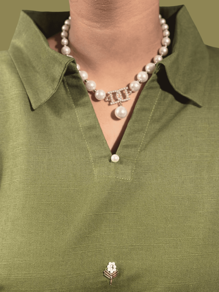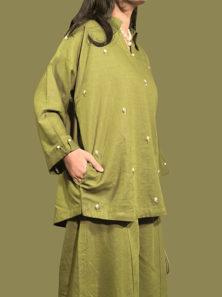 Evergreen is created for days that call for understated sophistication. The short rounded-hem top features a refined collar neckline, soft fold-cuff sleeves, and subtle pearl detailing. Hand-embroidered floral motifs in sequins and pearls add a touch of artisanal charm. Paired with loose, A-line trousers, this piece moves gracefully—bringing together ease, craft, and elegance.
